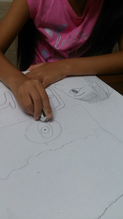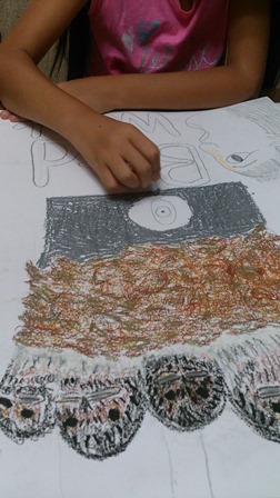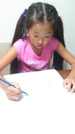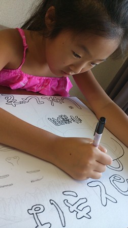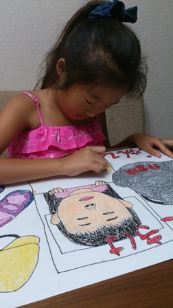 鉛筆で下書きして、ペンでなぞって、クレヨンで塗ってるの♡