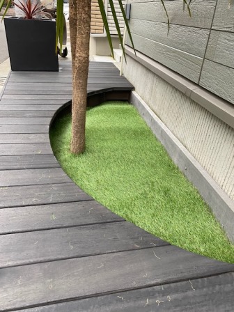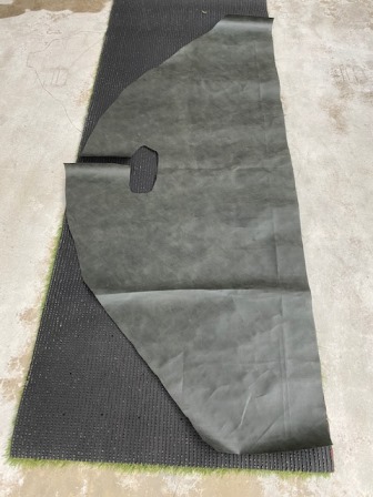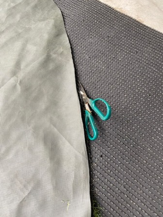 切った防草シートを型紙にして人工芝をハサミでカット!