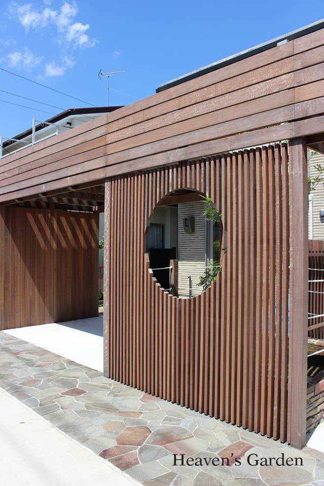 和風の縦格子を円形の窓に加工。車の上に太陽光発電設備が設置できる台を設置。同時に玄関とカースペースのゲートにしました。趣のある門構えだけでなく、機能的にも、経済的にも使えるエクステリアとなりました。