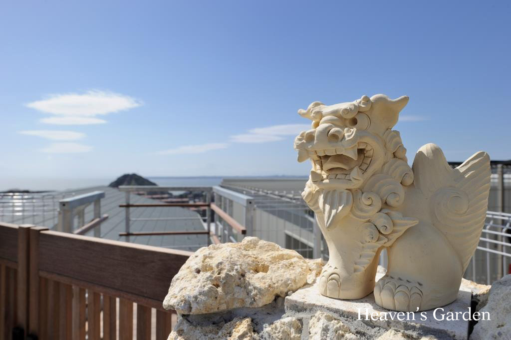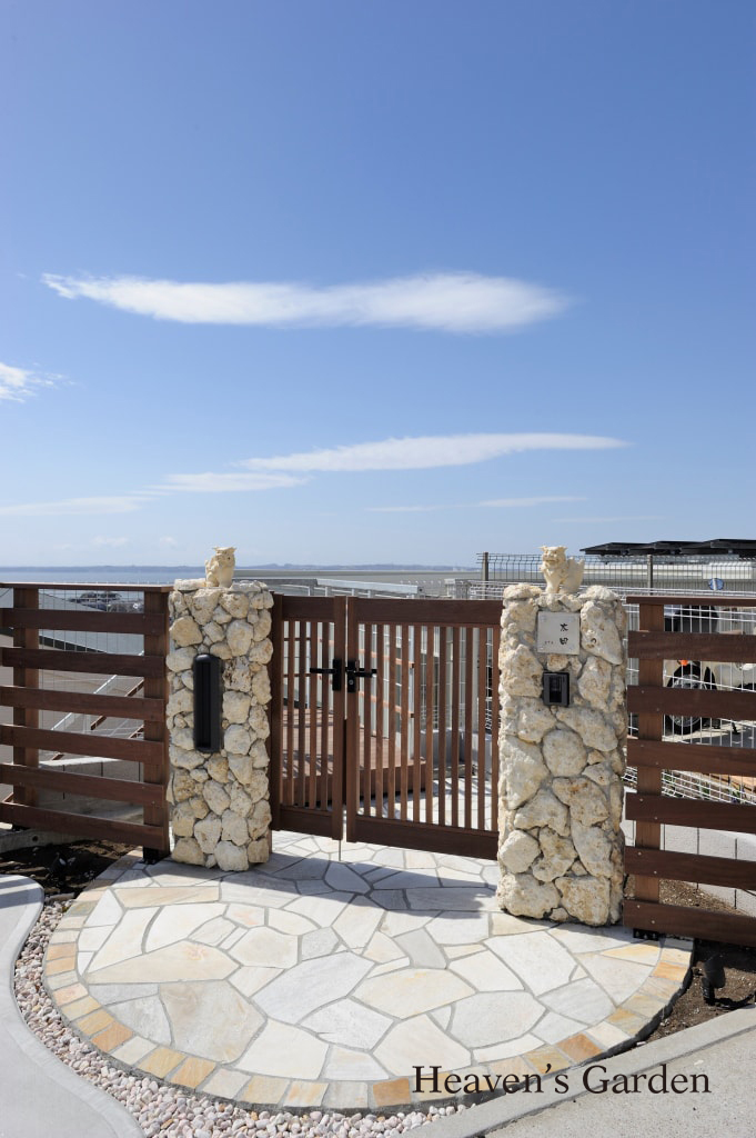 沖縄が大好きなOご夫妻。沖縄といえば海という事で、海の見える高台の土地を購入されました。ここからの眺めを最大限に活かすのが今回設計の最重要事項です。実はこの土地の下の東南側には古いマンションがあり、そこを如何に気にならない形に出来るのか、そして1階部分の庭の妨げにならず、日当たりを確保出来るか?その点を意識しながら設計しました。なだらかで美しいカーブを描くウッドフェンスはさり気なく視線を誘導し、海に導いてくれます。室内リビングのソファに腰掛けた時に目に入ってくるのは海と空。自然を肌で感じられるウッドデッキ空間になりました。