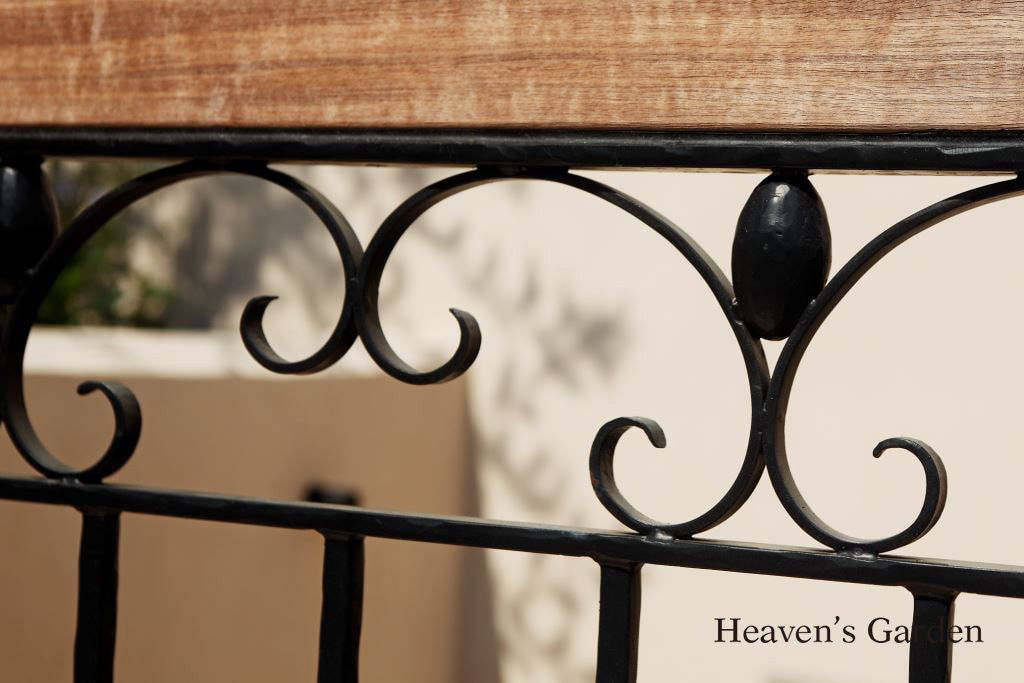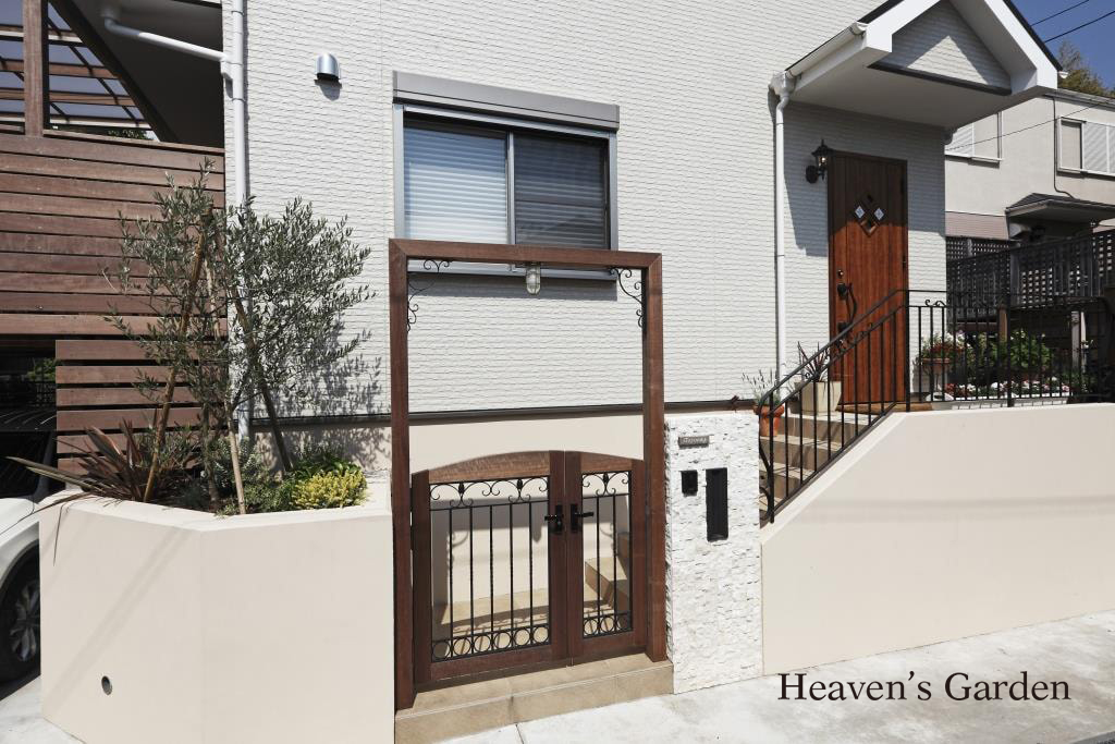 エクステリアもウッド+アイアンを併用したオリジナルのアーチ付き門扉を設置。アイアン手すりも完全オリジナルです。ナチュラルな質感の素材を使いながら、全体的に柔らかい印象のフォルムのエクステリアになりました。