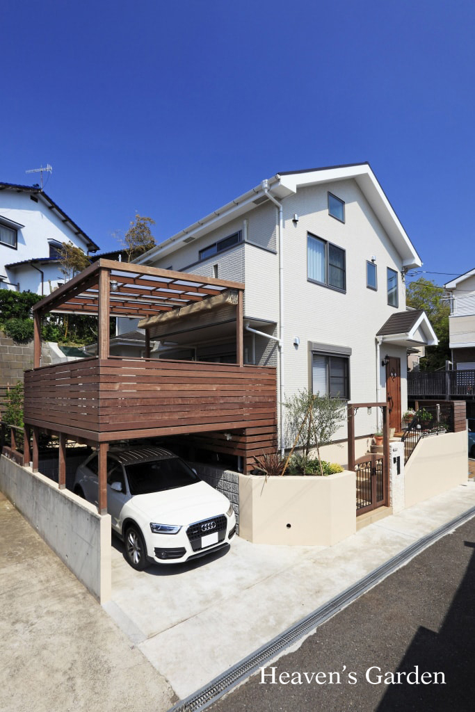 exteriorwooddeck No.11 藤沢市 T邸 雑誌『湘南スタイル』掲載 住宅メーカー:地域ビルダー スタイル:湘南エレガント 状態:新築 カテゴリー:クローズエクステリア ハイデッキ 参考予算:200万以上 車庫上ウッドデッキは第2のリビング。シェードと屋根を設置すれば一年中過ごしやすい空間に Previous Next Before 「愛犬がそのまま外に出られる空間が欲しかった」というT様。庭として使えるスペースがないわけではないが中型犬が遊びまわるには手狭で、何よりアクセスが大変。窓からすぐ出られる庭空間として、ウッドデッキをご提案させていただきました。ウッドデッキの設置個所は車庫の上。車庫の上の空間を無駄にせず、有効活用しました。更にウッドデッキの上に屋根を設置してウッドデッキが濡れないようにし、併せて車も濡れづらくなるように設計しました。屋根はクリアタイプのポリカーボネート板なので暗くならず、雨に濡れない屋根空間でありながら解放感があります。それでも日差しの強い時には紫外線対策としてロープ式のシェードを設置。全天候型でオールシーズン楽しめるデッキ空間になりました。 エクステリアもウッド+アイアンを併用したオリジナルのアーチ付き門扉を設置。アイアン手すりも完全オリジナルです。ナチュラルな質感の素材を使いながら、全体的に柔らかい印象のフォルムのエクステリアになりました。 BACK PAGE CONTACT