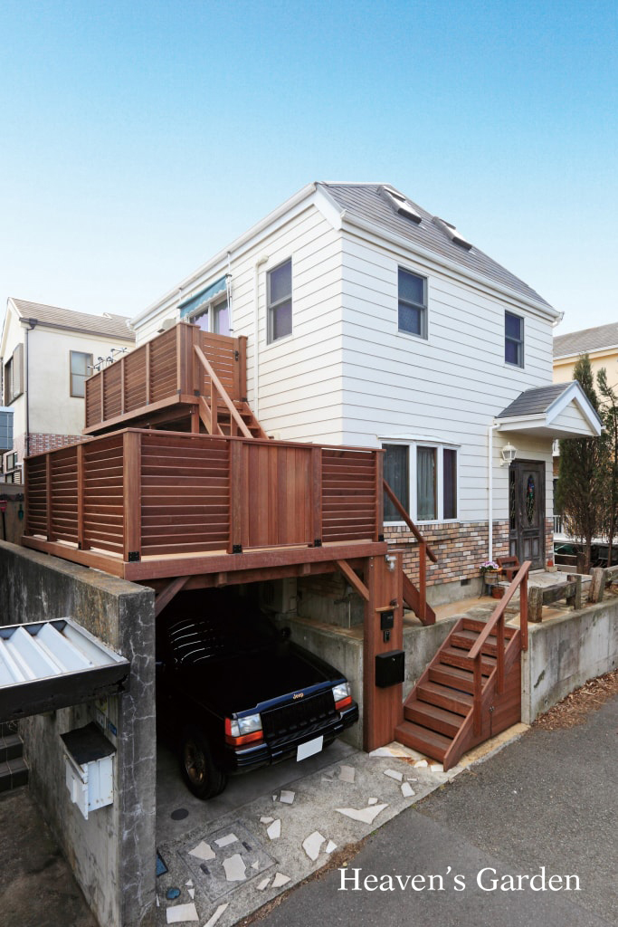 exteriorwooddeck No.15 藤沢市 S邸 雑誌『バイザシー』掲載 住宅メーカー:地域ビルダー スタイル:ナチュラル 状態:リフォーム カテゴリー:オープンエクステリア ウッドデッキ 参考予算:300万以上 道路~地面~車庫上~2階まで。全て使える空間になるウッドデッキ Previous Next Before 車庫、ウッドデッキ、バルコニーの3層デッキ 高低差のあるエントランスを経て、ウッドデッキにつながり、さらに2階バルコニーに繋がるS様邸。単なるウッドデッキではなく空間の有効利用とウッドならではの導線設計。デッキだけですと3層ですが、実は地面とのつながりも含めると4層構成になっています。複層型空間は空間効率も良く、便利で楽しい空間になります。 BACK PAGE CONTACT