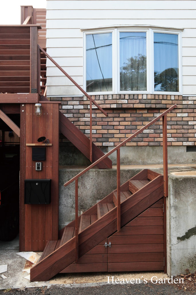 高低差のあるエントランスを経て、ウッドデッキにつながり、さらに2階バルコニーに繋がるS様邸。単なるウッドデッキではなく空間の有効利用とウッドならではの導線設計。デッキだけですと3層ですが、実は地面とのつながりも含めると4層構成になっています。複層型空間は空間効率も良く、便利で楽しい空間になります。