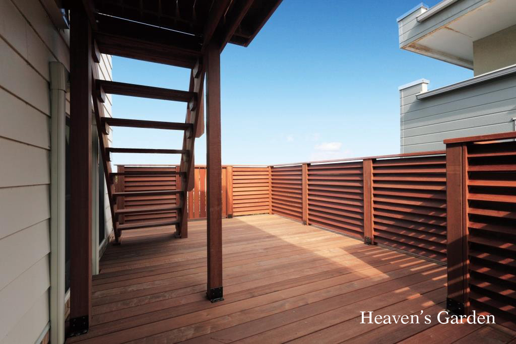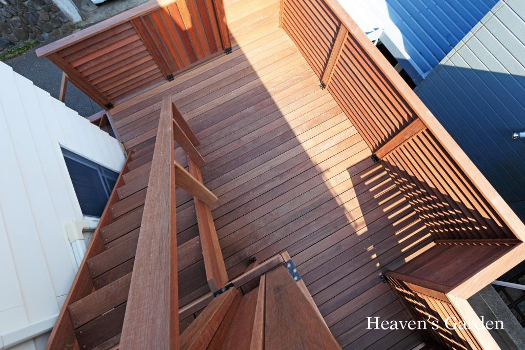 車庫、ウッドデッキ、バルコニーの3層デッキ