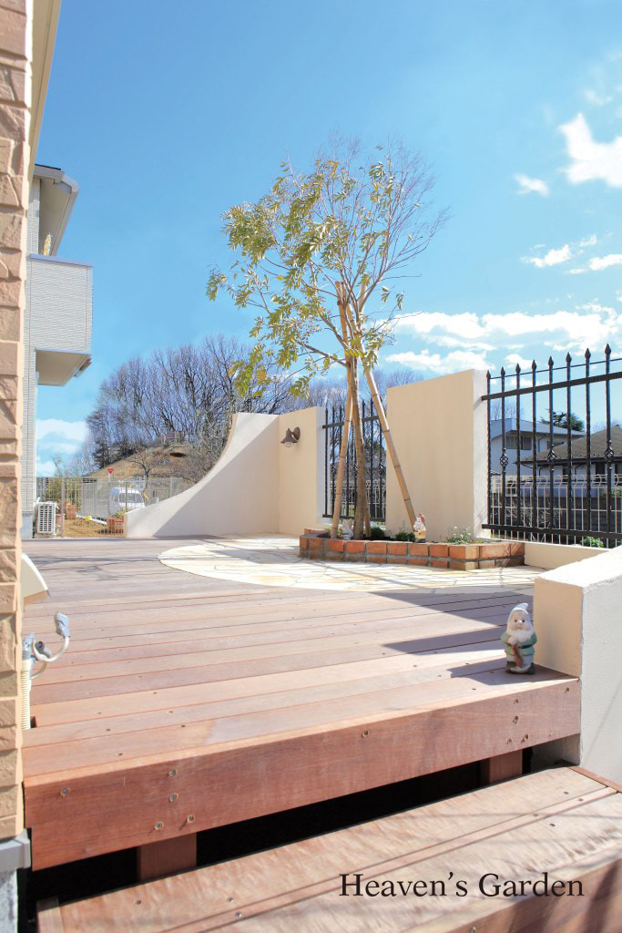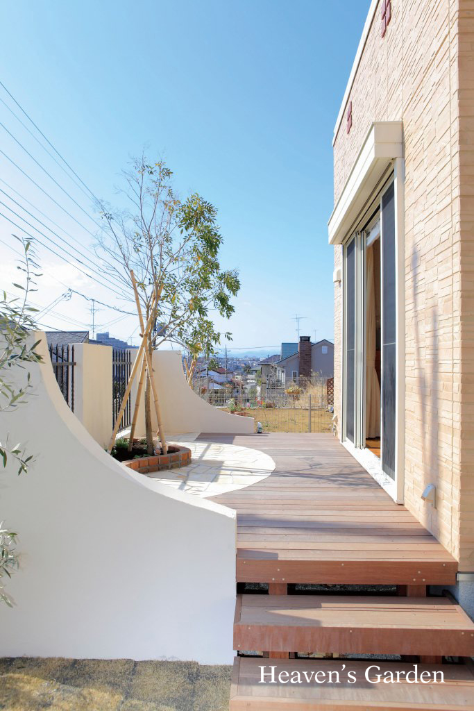 「ウッドデッキだけだとどうしてもエレガントさが出ない、でも家の床との段差は極力少なくしたい」そんなご要望を形にした今回のテラス+ウッドデッキ。道路側の電柱前に電柱隠しになる樹木を配置。それを植え込むのに必要な植栽スペースをつくりました。機能的にも家からの出入り、基礎の通気などにも十分配慮し、使い勝手の良い空間になりました。ただそれだけではなく、部屋からの視界に入ってくるのはアイアン調のフェンスや緩やかなカーブを描く白い壁。ナチュラルでエレガントな空間になりました。