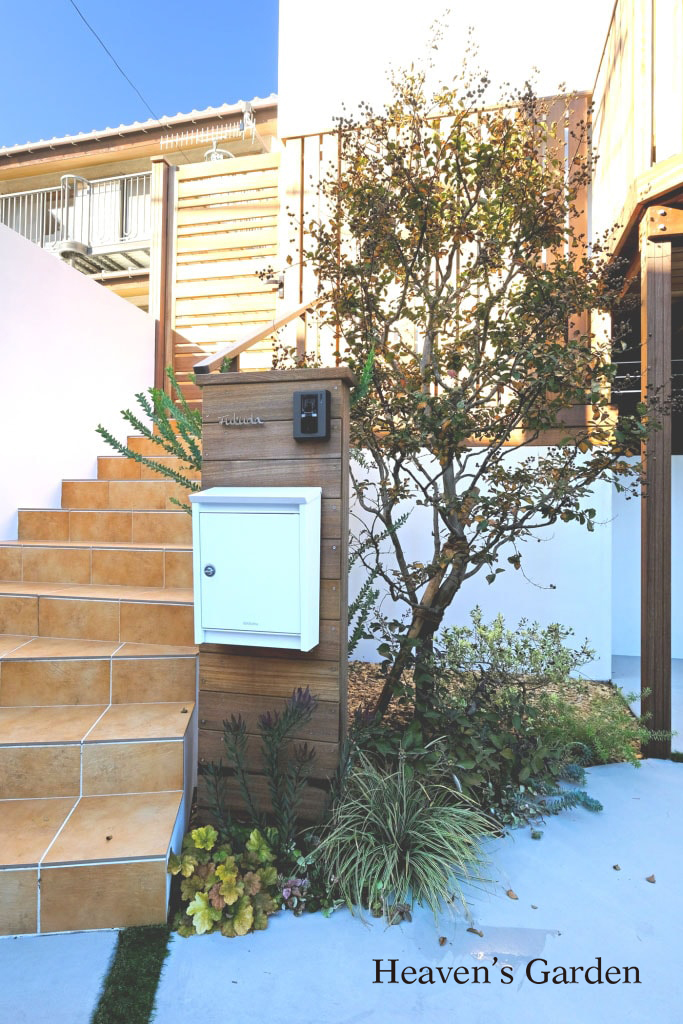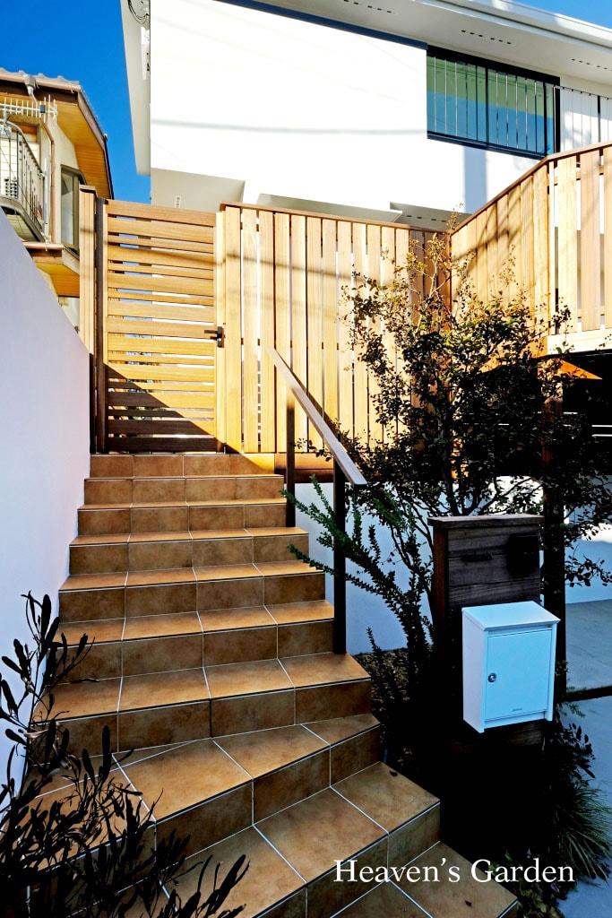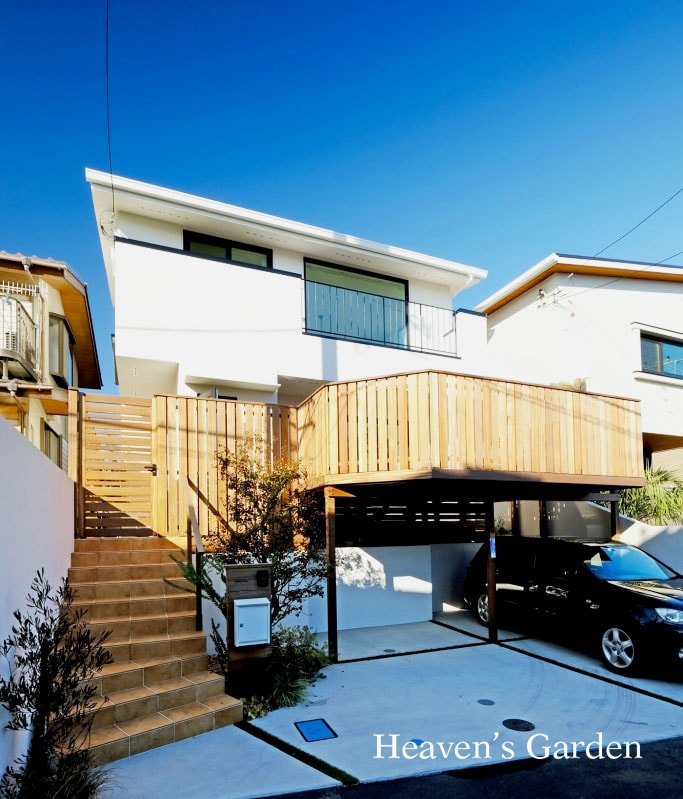 茅ヶ崎の海岸エリアに建つF様邸。ここは車庫空間と庭空間を兼用する形のエクステリアとなりました。海岸エリアでは珍しく高低差があり、それを活かした形での計画になりました。車庫スペースの上に設置するウッドデッキは床面より400mm程段差を付け、階段で上がる形に。これにより車庫スペースはハイルーフ車でもゆとりを持って入れるようになりました。またメインの門扉もウッドで造作しました。統一した素材で全体に湘南らしい自然で力の入りすぎないエクステリアになりました。