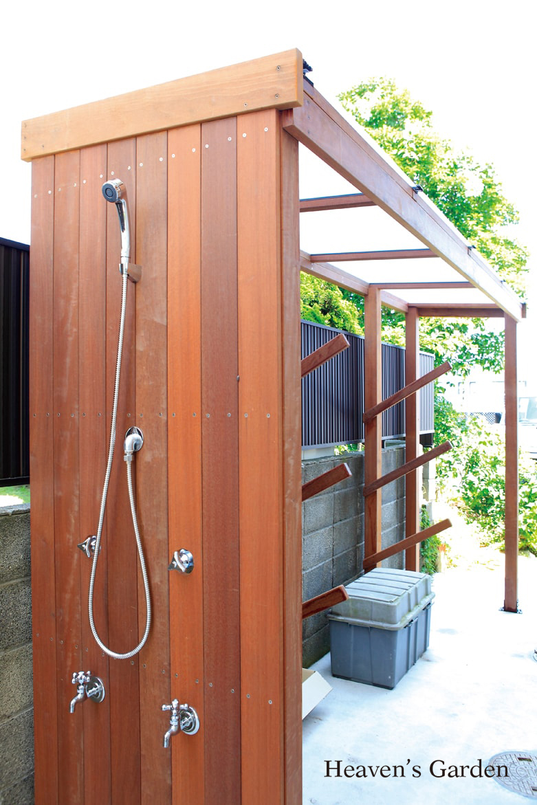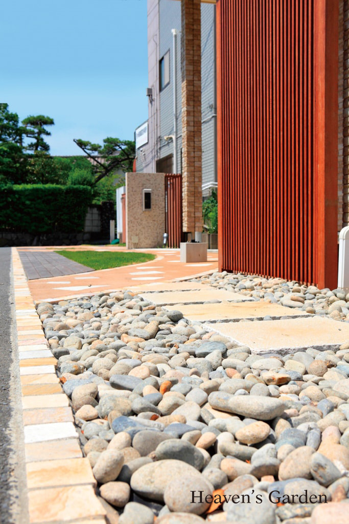長い専用通路のあるH様邸。この長いアプローチをより魅力的に、ナチュラルな建物とバランスの良い仕上がりになるようにデザインさせていただきました。アプローチの脇に均等感覚で立っているマリンライトのついたウッドフェンス。実は隣地側のエアコンの室外機をカバーするためのものでもあります。エントランスには大き目の砂利を敷き込みました。裏には屋根とシャワー付きのサーフボードラックを設置。収納力だけでなく、機能的な空間になりました。