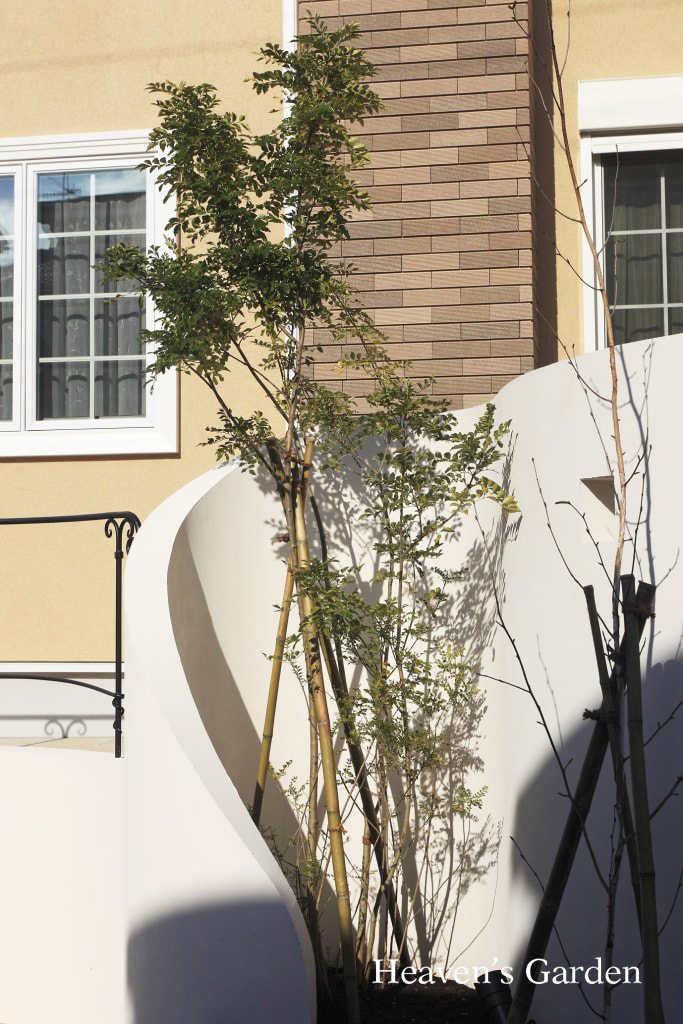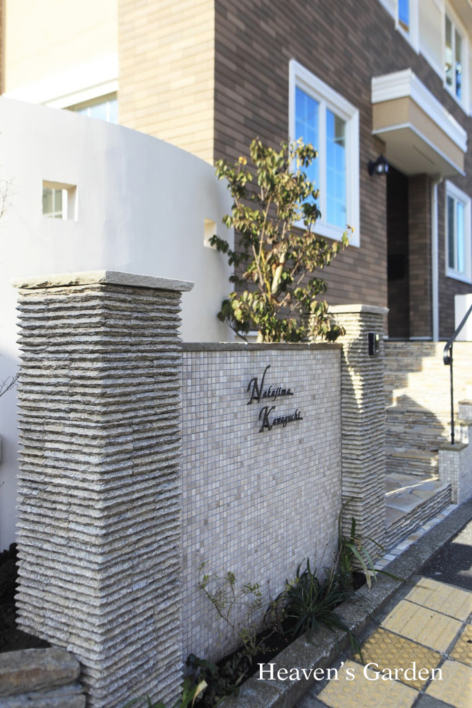 閑静な住宅街の中でも一際、重厚感を放つN様邸。ナチュラルでエレガントなこの佇まいのエクステリアは家とのバランスを考えてプランニングしました。家が横ラインのデザインが多く、またタイルなどの重量感のある仕上材を多用していることもあり、エクステリアも重厚感のある横ラインを基調にしたデザインとしました。コーナー部分には石積みの植栽スペースと配置、下支えとなる基礎の重量を高めに設定しました。メインエントランスの階段は天然石の小端積みを多用。趣のある階段アプローチになりました。また庭側は柔らかなS字カーブを描く白い壁で目線を区切り、シンボルツリーを植え込みました。
