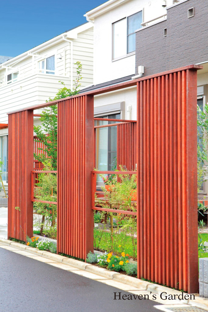 「建物の個性がないのでエクステリアで個性を出したい」そんなご要望から始まったお打ち合わせ。建物のカラーがなければエクステリア的には逆に演出しやすい部分もあります。今回は大胆に高さ2.2mのウッドスクリーンを等間隔に設置。加えて上部に笠木を通し、空間に一体感を持たせました。全体のイメージとしてナチュラルでソリッドな印象のエクステリアになりました。