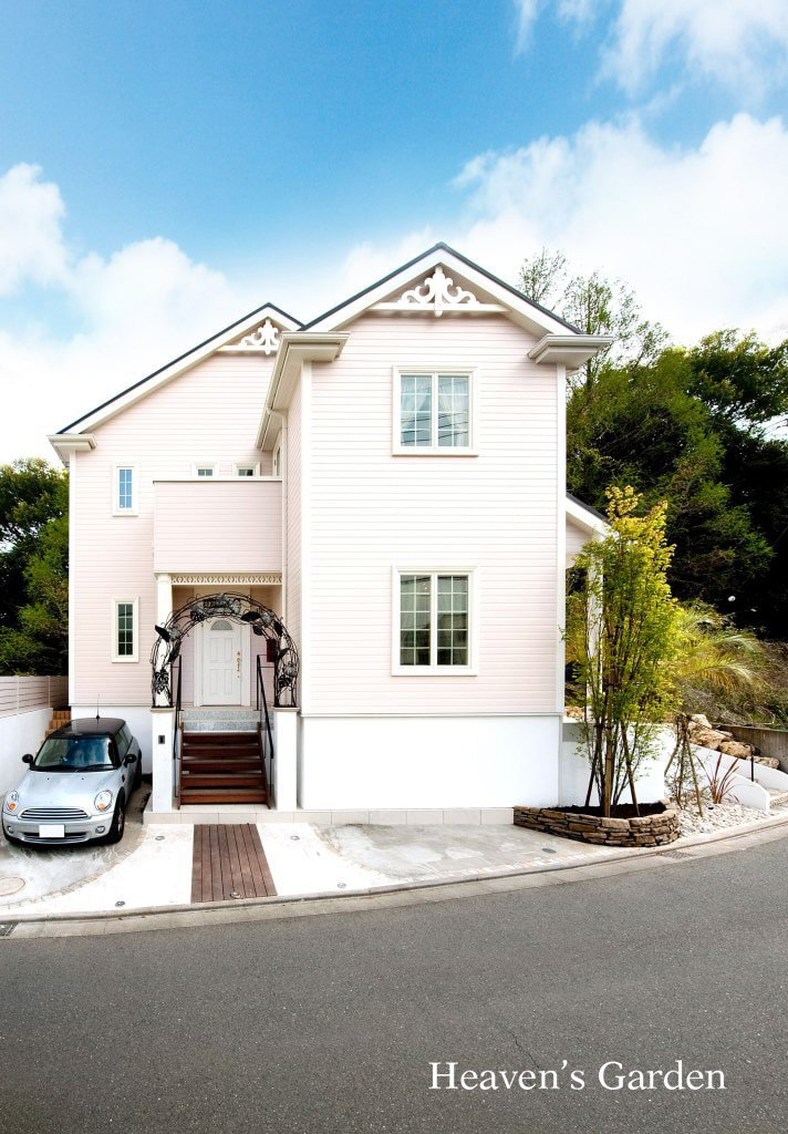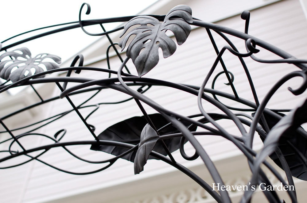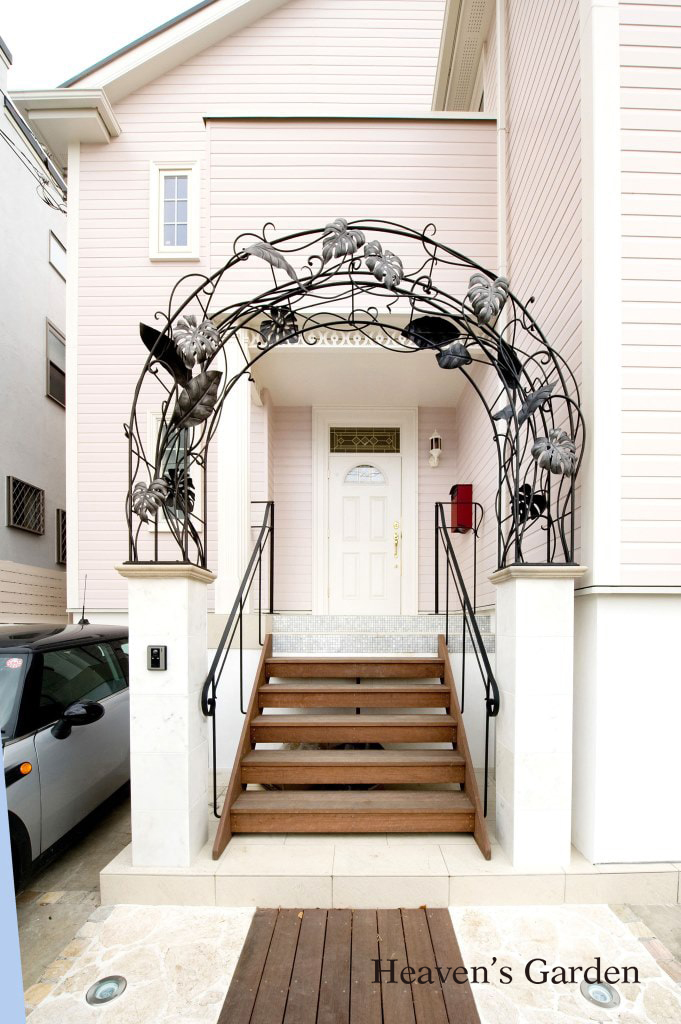 湘南エリアに似合うエレガントなエクステリア「湘南エレガント」をテーマにしたエクステリア。メインエントランスはモンステラをモチーフにしたアイアン製のアーチを配置。ゲートをくぐる楽しみのあるアプローチになっている。またガーデン側のエントランスがここの見せ場。なだらかな曲線を描いたアプローチがフレンチドアのテラスに導いてくれる。大きなココスヤシがシンボルツリーとして迎えてくれ、その嫋やかな葉の下の影を踏みながら階段を上る。湘南らしさと輸入住宅の魅力の詰まったエクステリアです。