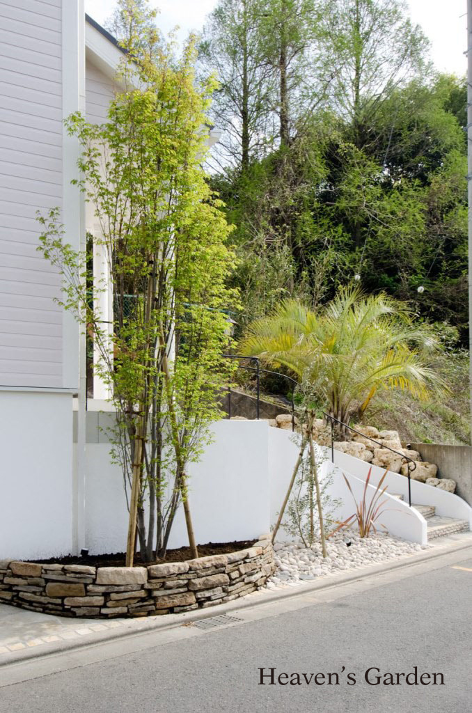 exterior No.45 茅ヶ崎市 K邸 雑誌『湘南スタイル』掲載 住宅メーカー:東急ホームズ スタイル:湘南エレガント 状態:新築 カテゴリー:オープンエクステリア 参考予算:400万以上 爽やかな風を感じながらも、優雅さが共存するデザイン Previous Next 湘南エリアに似合うエレガントなエクステリア「湘南エレガント」をテーマにしたエクステリア。メインエントランスはモンステラをモチーフにしたアイアン製のアーチを配置。ゲートをくぐる楽しみのあるアプローチになっている。またガーデン側のエントランスがここの見せ場。なだらかな曲線を描いたアプローチがフレンチドアのテラスに導いてくれる。大きなココスヤシがシンボルツリーとして迎えてくれ、その嫋やかな葉の下の影を踏みながら階段を上る。湘南らしさと輸入住宅の魅力の詰まったエクステリアです。 BACK PAGE CONTACT