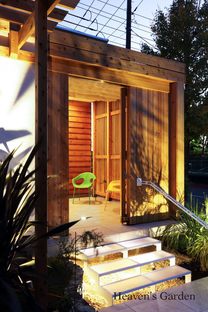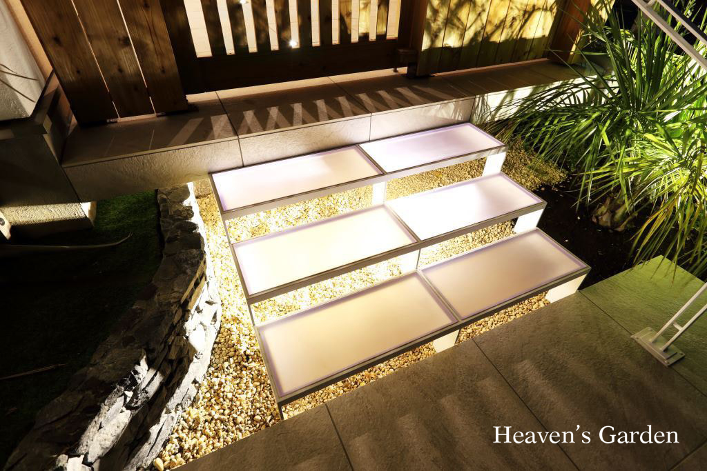 夜になるとこの空間は別の表情を見せます。ドローイングポーチの床に埋め込まれたライトは天井のシェードに反射、ポーチそのものが照明器具として光を放ちます。階段下に埋め込まれたライトが光ると半透明の階段から光が漏れ、ガラスの階段のような輝きを見せます。外周部の植栽も光を纏い、その葉のひとつづつが輝きだします。