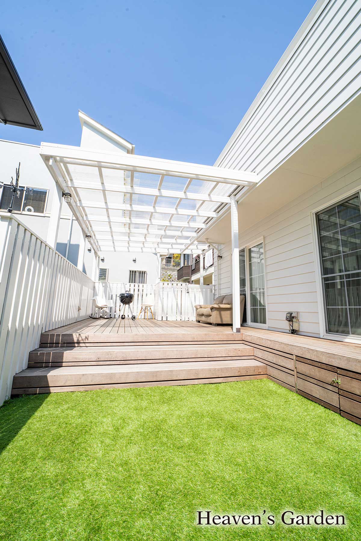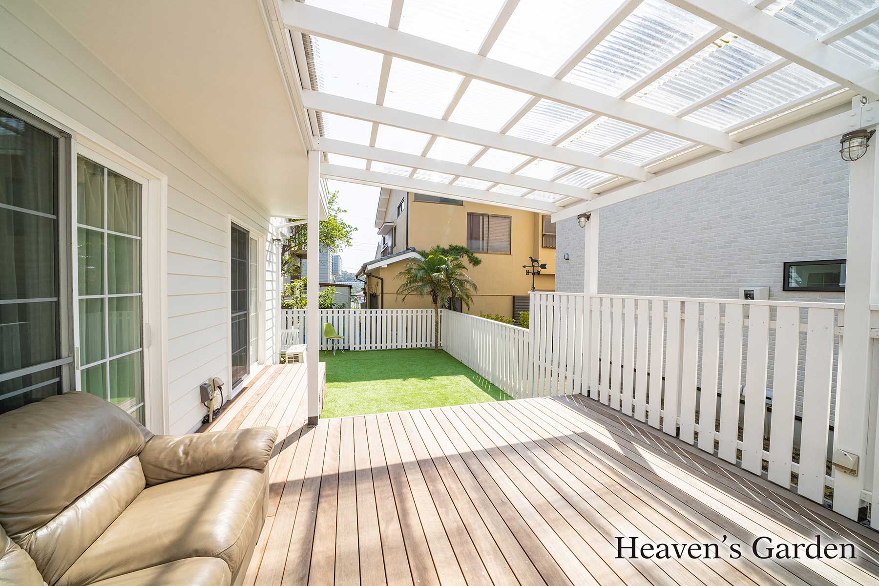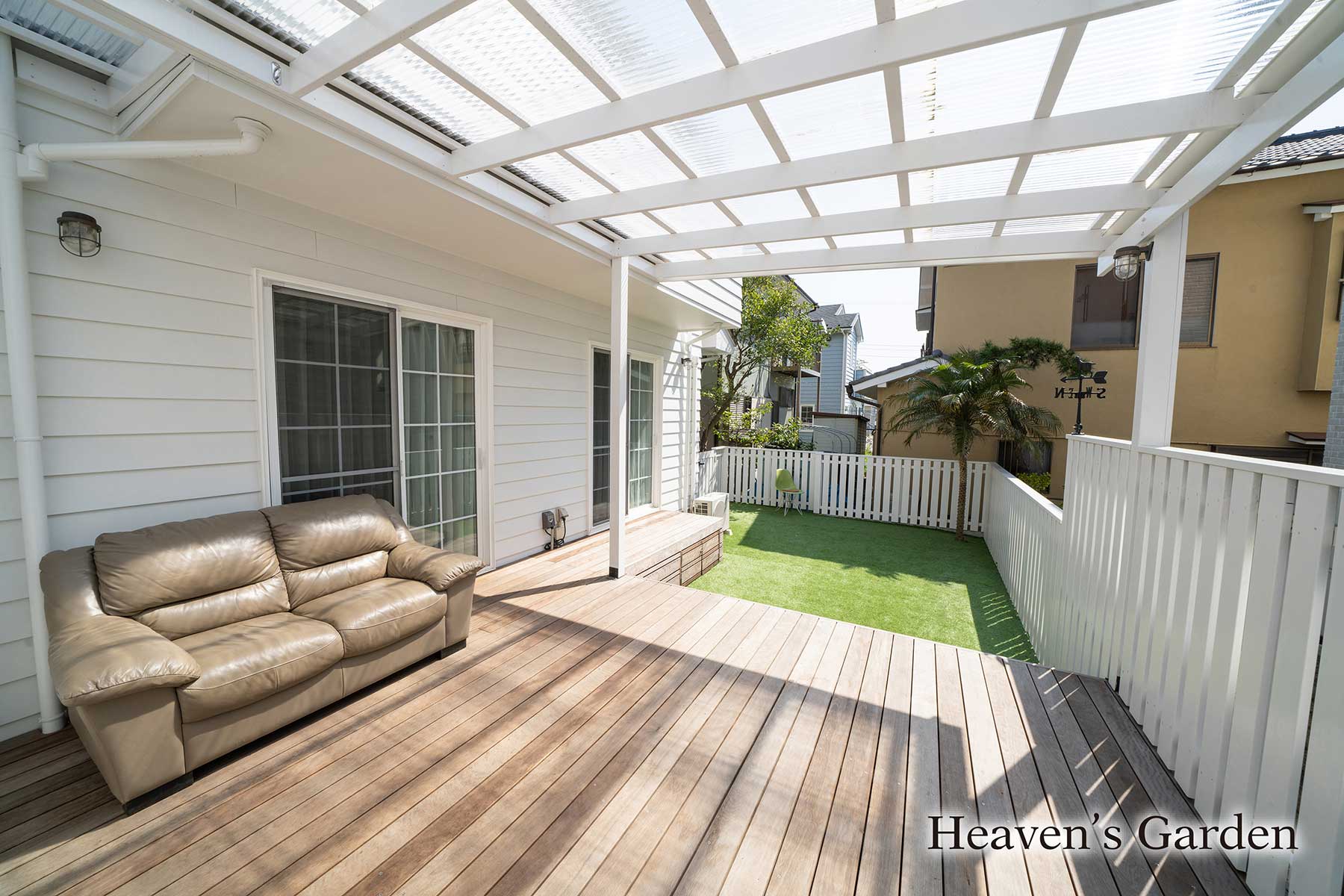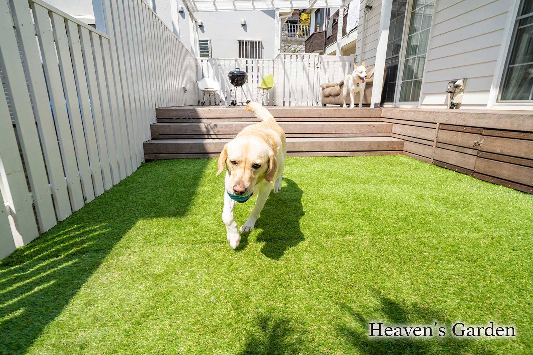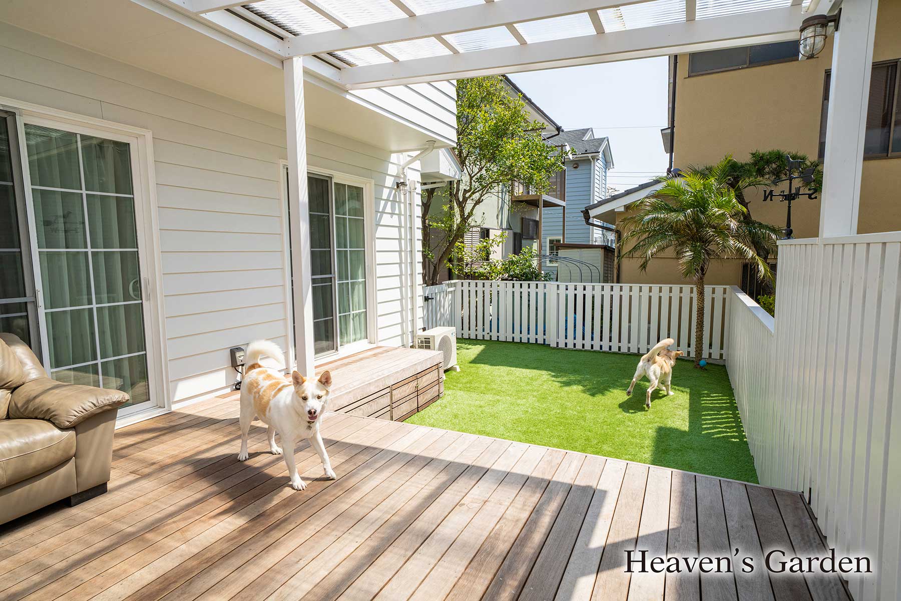 完成後はウッドデッキと人工芝のお庭をワンちゃんたちが走り回れるようになりました。そしてなかなか出てこれなかった子もこのお庭なら出れるようになり、やがて散歩も行けるようになりました。また雨の日も広い屋根のお陰でデッキ下のソファで寛ぎながら、ご夫婦とワンちゃんとで過ごしているそうです。