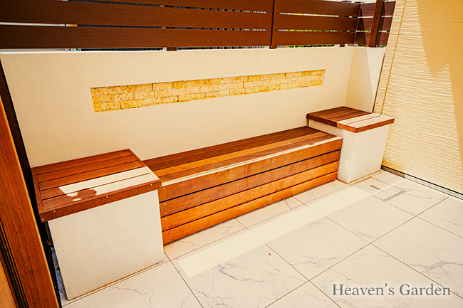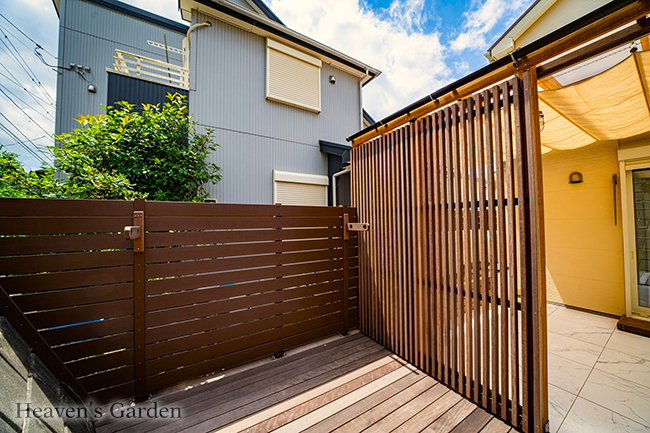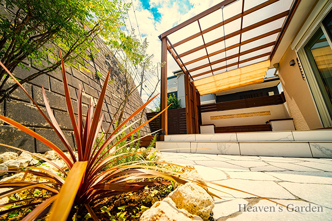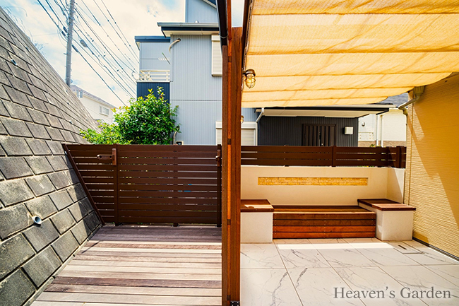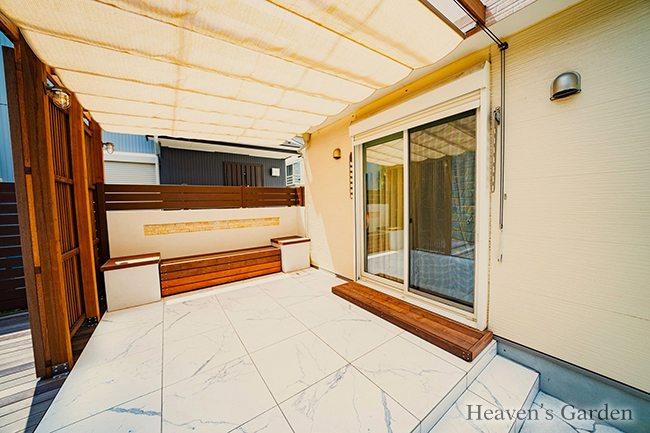 メインのテラスはリゾート風にしたいとのご要望から、大理石調の大判タイルを使用しました。大判タイルは目地が少なくダイナミックなので高級感の演出に最適です。プライベートなお庭を作る上での一番の問題が擁壁上からの目線でした。歩道があり見下ろされるお庭の為、シェードの設置、もしくはすりガラス調の屋根を提案させていただきました。お客様の一番気にしているポイントでもあった為、どちらも採用していただきました。シェードを広げなくても目隠しがあり、日除けも必要に応じて使い分ける最高の使い勝手となっております。スクリーンフェンスの外側はウッドデッキとなっており、擁壁から流れてくる雨水の水捌けが良く、汚れが気になりづらくなっております。また、この空間は物干しスペースとなっており、テラスやリビングからはスクリーンフェンスで隠れている為、物を干していても景観を損ないません。