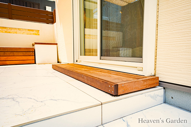 肌に触れるベンチやサイドテーブル、靴脱ぎステップは天然木で出来ており手触りは柔らかく、温かみのあるファニチャーとなっております。