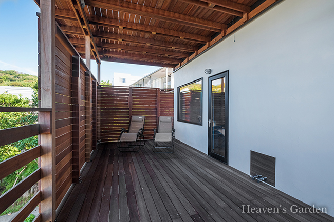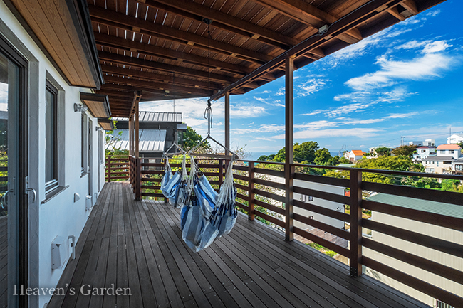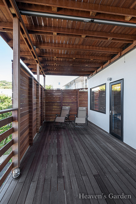 そして南側の海を臨むウッドデッキ。ここがこの建物の中でも最重要な場所の一つです。ウッドデッキも単純に作れば良いのではなく、適切な大きさと形状があり、ロケーションごとに計画する必要があります。今回のウッドデッキで最重要なのは海を眺める為のウッドデッキなので、最も海が美しく見えるようにするにはどうしたら良いか、考え抜いてこの形状になりました。また2階デッキは1階より全体に600mm大きく張り出した作りなっており、1階の日除け的な要素もありながら、メインスペースの2階ウッドデッキを更に快適な空間にしています。そして1階のウッドデッキは建物1階のサウナで水風呂に入った後に外気浴が出来るスペースとしても使われています。自宅に居ながらにしてととのう事ができるという最高の空間です。もちろんバスルームの目隠しも兼ねているので通常のバスタイムも快適そのものです。