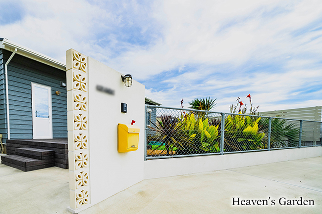 門袖は南国風のデザインとして代表的な花ブロックをアクセントとし、お客様のこだわりの表札とポストがとても可愛らしくマッチしております。