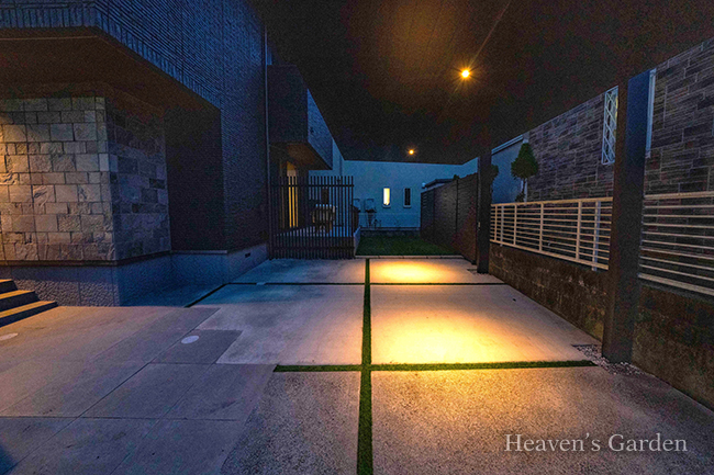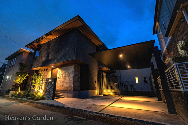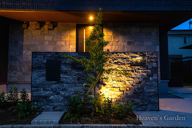 門袖の天然石のランダムな凹凸や樹木の陰影、カーポートに埋め込まれたダウンライトから照らされる綺麗なコンクリートがとても印象的です。