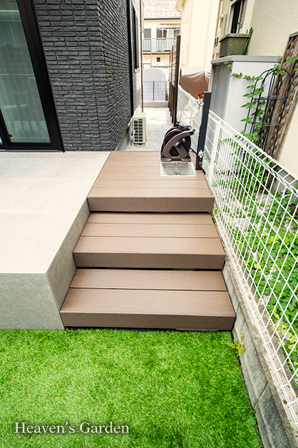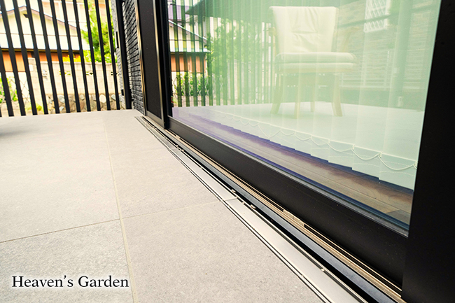 お庭に降りる樹脂デッキのステップに一体で埋め込まれているパンが、フラットな収まりとなっており、個人的に気に入っているポイントです。
