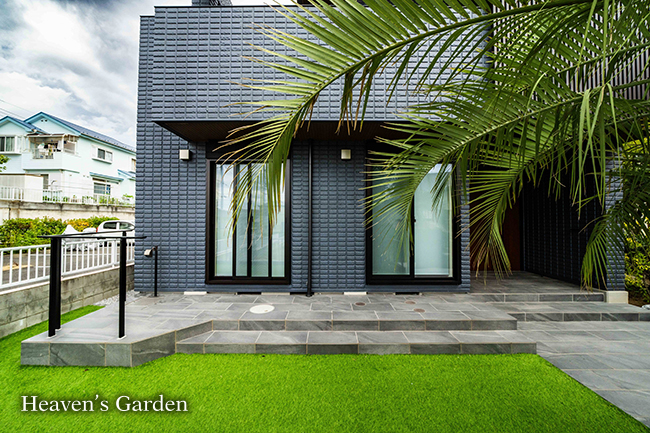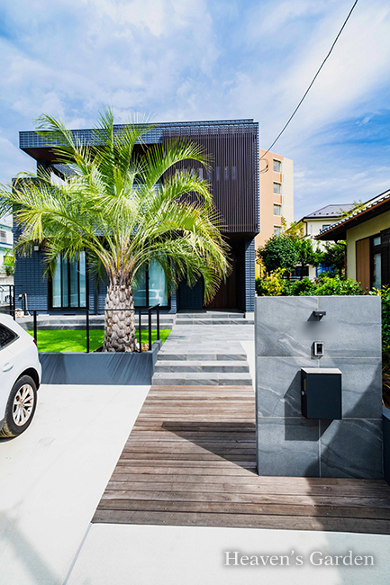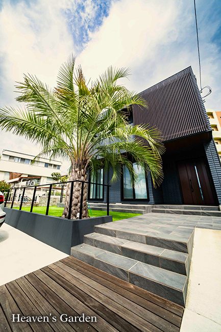 EXTERIORWOODDECK No.75 藤沢市 S邸 住宅メーカー:湘南モダン スタイル:ナチュラルリゾート 状態:新築 カテゴリー:湘南モダン 参考予算:450万以上 ヤシの木を潜るアプローチ Previous Next 建物に合うスマートなエクステリアをイメージして設計しました。 打ち合わせ当初、お客様は黒系統の色合いが多く、厳つい印象になってしまう事を懸念していましたので、思い切って大きめのシンボルツリーを入れる事を提案させていただきました。 そのまま話がテンポよく進み、『ココスヤシを潜るアプローチ』というテーマが決まりました。 基本的にはグレーのタイルとブラックの金物で、建物本体の持つ堅実でスマートな印象を引き継いでいます。アクセントで天然木のアプローチとグリーンを入れる事で、明るく暖かい空間がとても良いバランスになっています。 特にココスヤシは大きさに拘り、建物を程よく隠す事で遠近感を出しました。 アプローチを歩くとヤシの葉を潜る様になっており、お客様のイメージを再現できました。 駐車場からアプローチ、お庭まで全体的にワイドを広く取る事で、余裕のあるオープンなエクステリアが出来ました。 BACK PAGE CONTACT