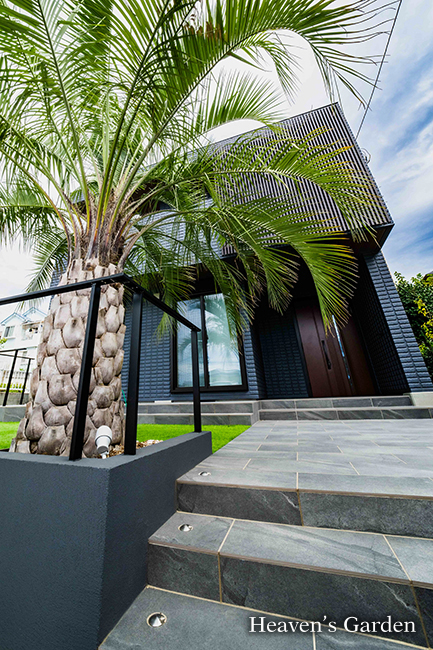 アプローチを歩くとヤシの葉を潜る様になっており、お客様のイメージを再現できました。