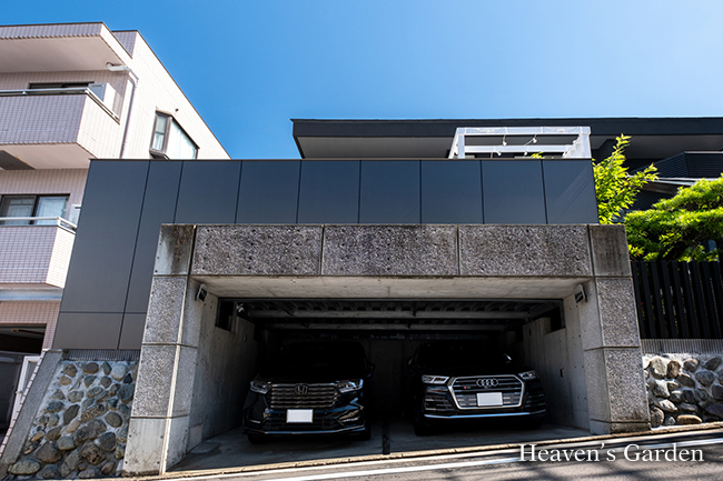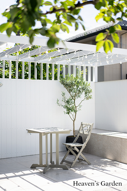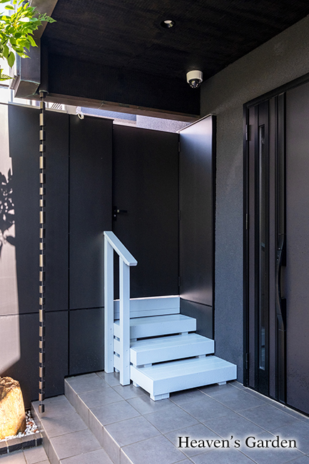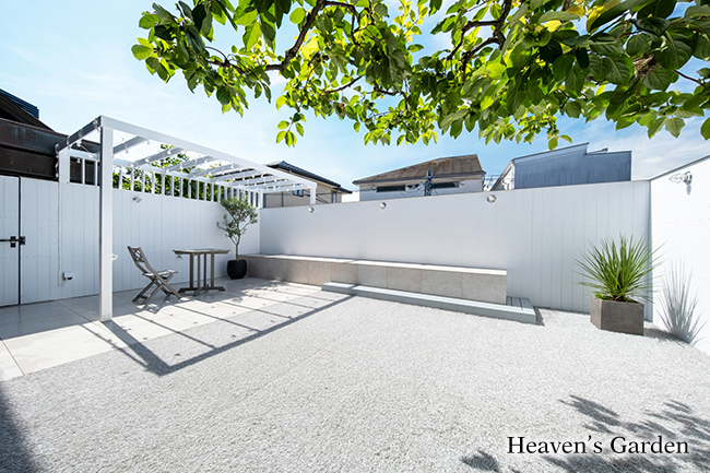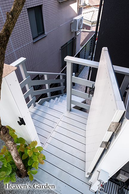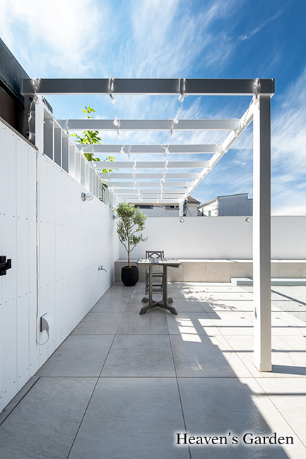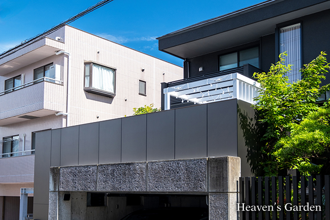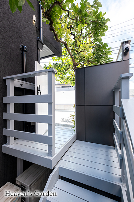 以前あったガレージの上のウッドデッキが経年変化と共に朽ちてしまった事をきっかけに改めて鉄骨フレーム+タイルを使った庭空間、そしてワンちゃんの遊び場にもなる空間を作りました。よりプライベートな空間にするため、外周部には高さと強度にこだわりながら目隠し塀を作りました。建物全体の外観は黒をベースにした重厚感のある色合いなので、そのイメージを踏襲する形でややメタリックなダークグレーでまとめました。また内観は真逆の純白に極力近いブライトホワイトな空間になっております。壁面はホワイトのフェンスを隙間なく貼りました。また床面は鉄骨のフレームの上にデッキプレートを敷き、その上にコンクリートを打ち強度を担保、その上でタイルとシルバーの人工芝を貼りました。デッキ空間の中には元々あった柿の木をそのまま残すため、床のデッキプレートを一部欠きこむ形で作りました。スクエアな人工物の空間に枝ぶりの良い樹木が入ることで空間が自然なものに感じられます。全体的にシンプルながら広がり感があり、人もワンちゃんも心から解放的になれる空間になりました。