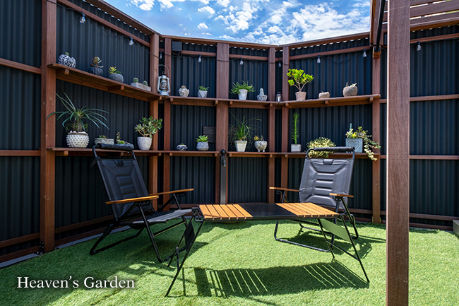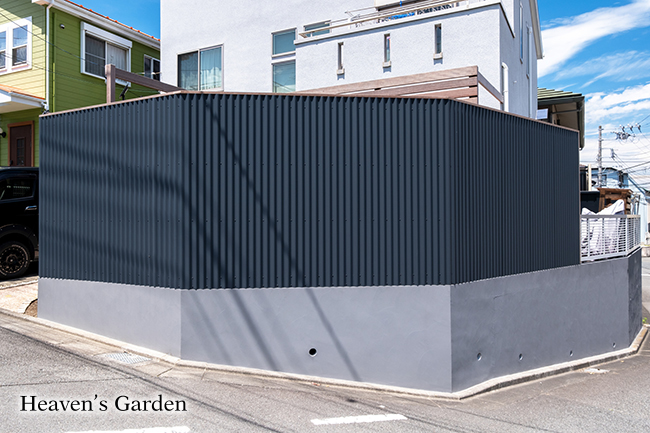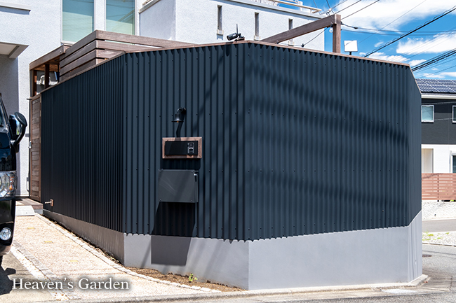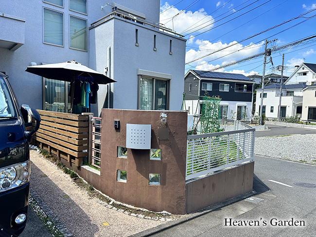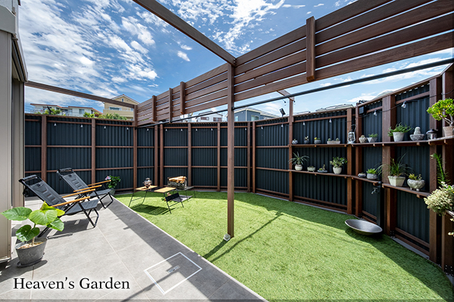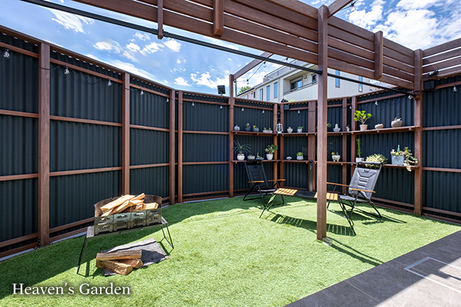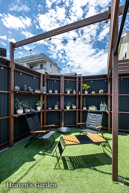 毎週末、お気に入りのキャンプギアを愛車に詰め込んで日本各地の自然空間でキャンプを楽しまれているK様。そんなK様のご要望は自宅でもキャンプが楽しめることでした。自宅でキャンプをする時もそうですが、外部からの目線を徹底的に遮断しないと解放感が得られないこともあり、目隠しを複合的に行うことに。外周部の黒のガルバリウム鋼板の塀は特注で作成。内外から見てもブラックの空間になりました。内側のガルバリウム鋼板の下地部分には棚を設置。季節のお花やキャンプギアを置いたり、飾りと実用性含め楽しめるようにしました。また坂の上の方からの目線対策はウッドフレームに目隠し板を貼り下げることによりわずかな範囲の目隠しで効率的に目隠しをしました。またワンちゃんが自由に駆け回れるようにするため、段差を少なく、庭との高さにもこだわりました。外部から庭に入る扉にはナンバー式のロックを採用。入居者だけの特別な空間になりました。